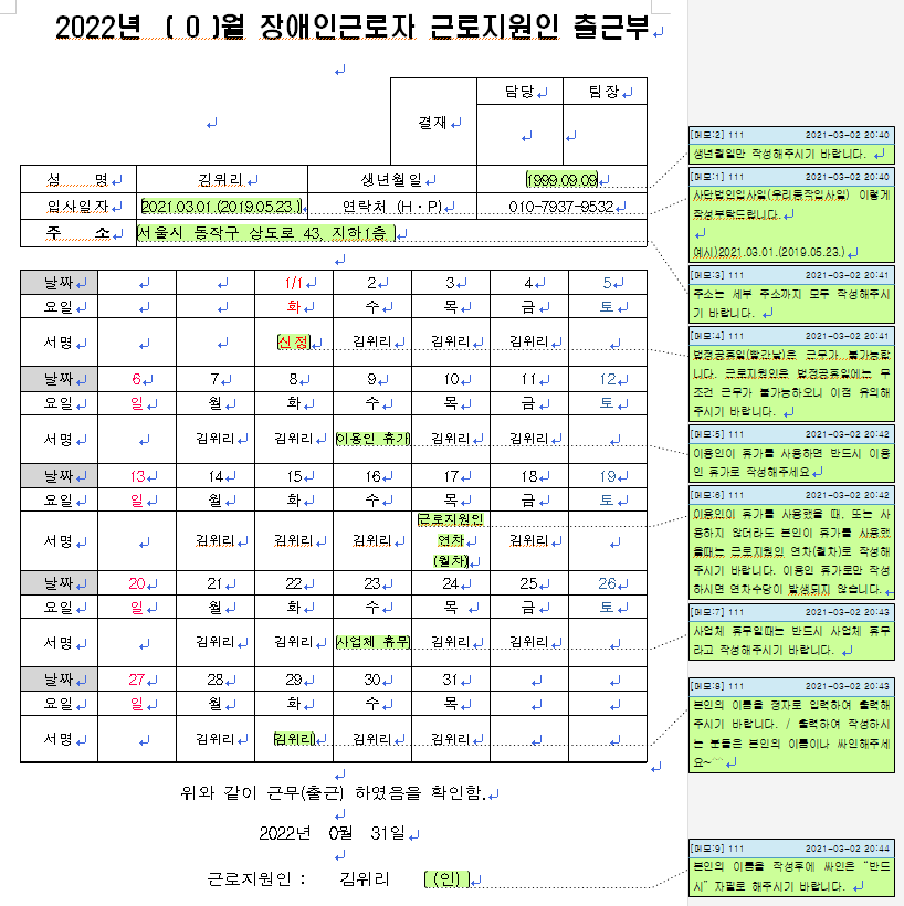 ※ 출근부 작성시 반드시 입사일자 확인 부탁드립니다.