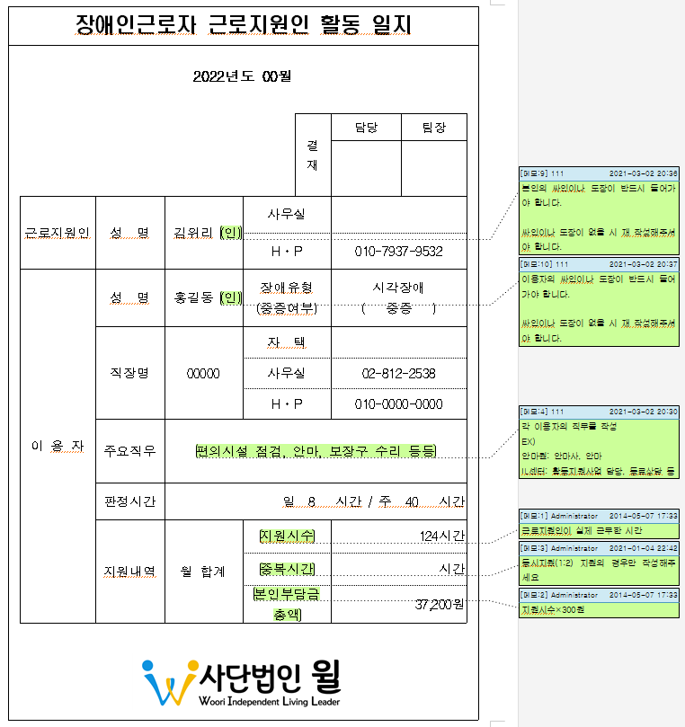 안녕하세요. 사단법인 윌 입니다. 근로지원인 11월 출근부 및 활동일지 입니다. 11월 일지는 11월 25일(금)까지 제출해주시기 바랍니다.